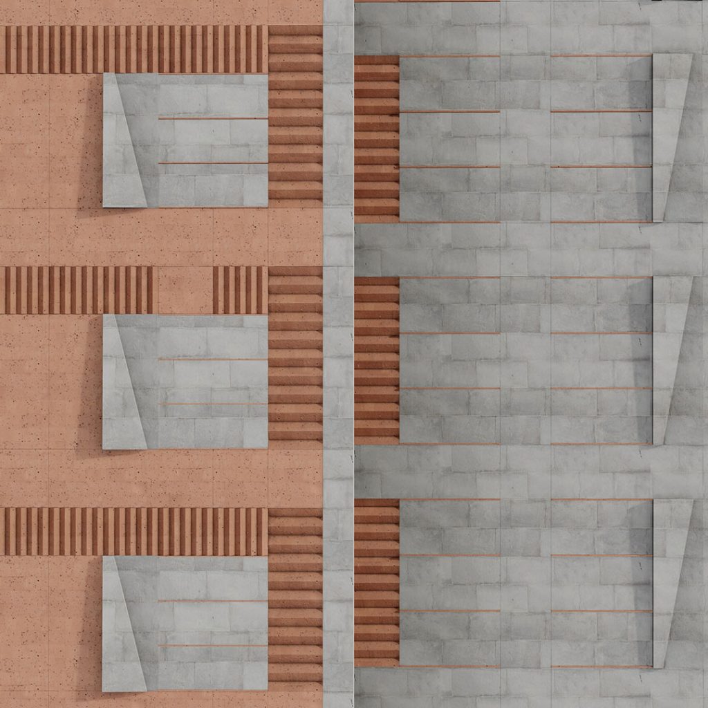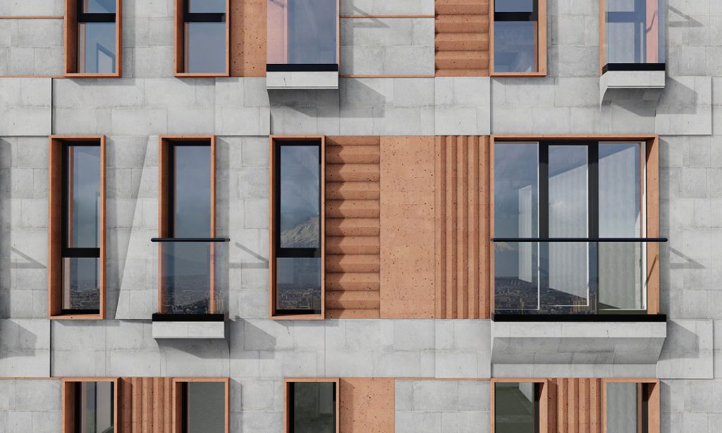 The façade is articulated with a combination of red tuff stone and light travertine, materials that are traditional to Yerevan yet expressed here in a contemporary manner. The interplay of warm red stone and light-colored travertine creates a distinctive contrast, while vertical and horizontal divisions through recessed window bays and projecting frames provide rhythm and depth.