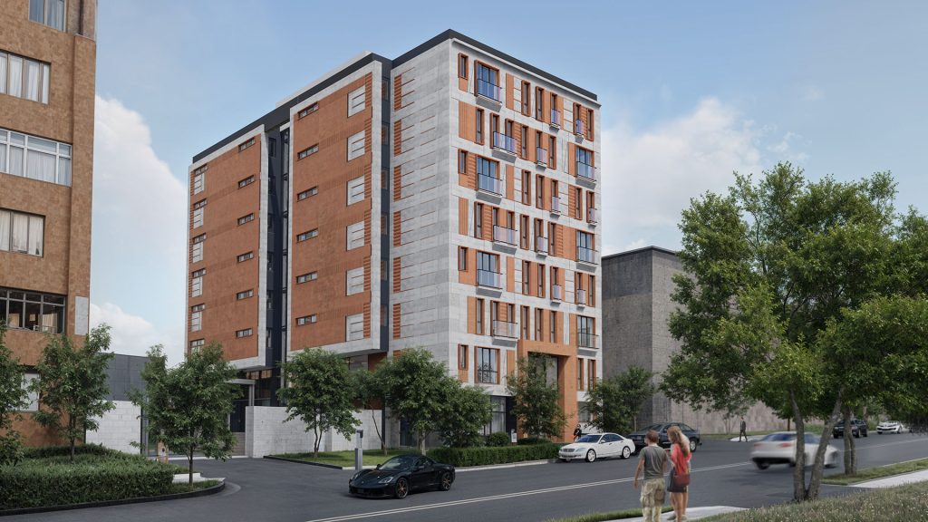 This residential building is located on Davit Anhaght Street, Yerevan, and is conceived as a modern mid-rise development that provides high-quality living spaces within a dense urban environment.