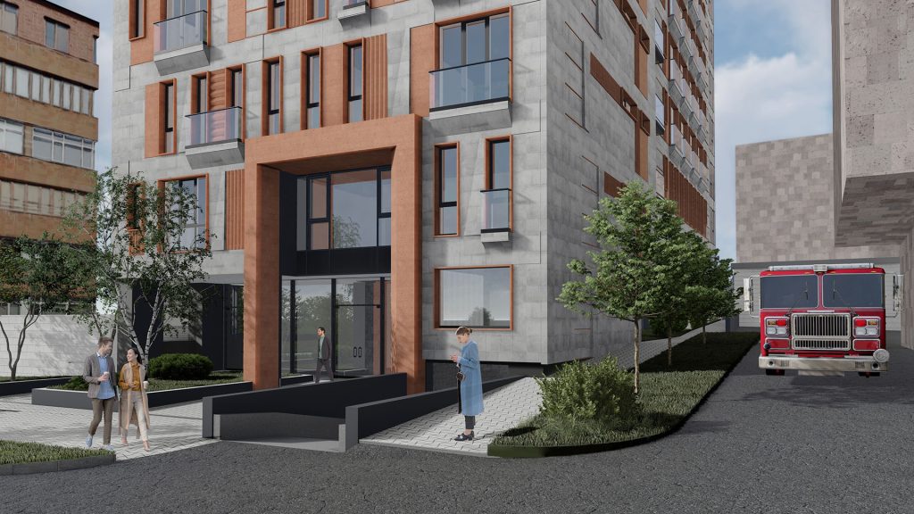 Large windows and balconies ensure natural light, ventilation, and outdoor extensions of living spaces. The use of durable local stone materials reinforces both the building’s longevity and its architectural dialogue with Yerevan’s urban fabric.