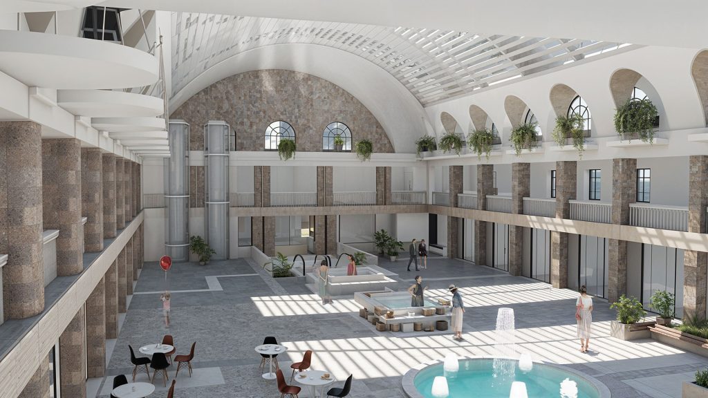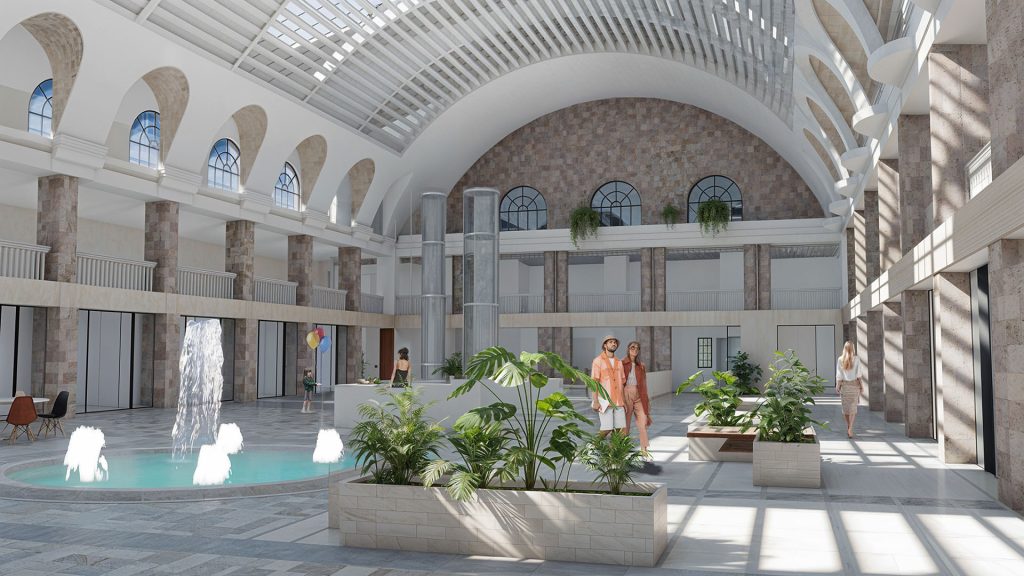 At the core of the development is the renovation of the historic market building, originally constructed in the 1950s. The preserved structure retains its architectural identity while being adapted for modern use, ensuring continuity between the city’s cultural heritage and its present-day needs.