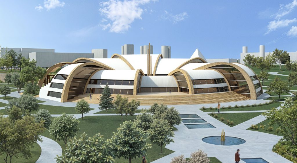 The Image of a Steppe Flower: The main idea behind the project is the metaphor of a steppe flower, which inspired the volume-spatial design. Twelve asymmetrical arches, fanning out radially from the center, form the unique petal-like shell of the building. This image symbolizes the historical and spiritual connection between the Russian and Kazakh people.