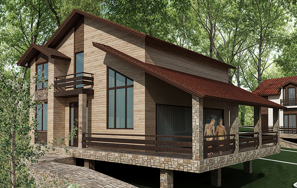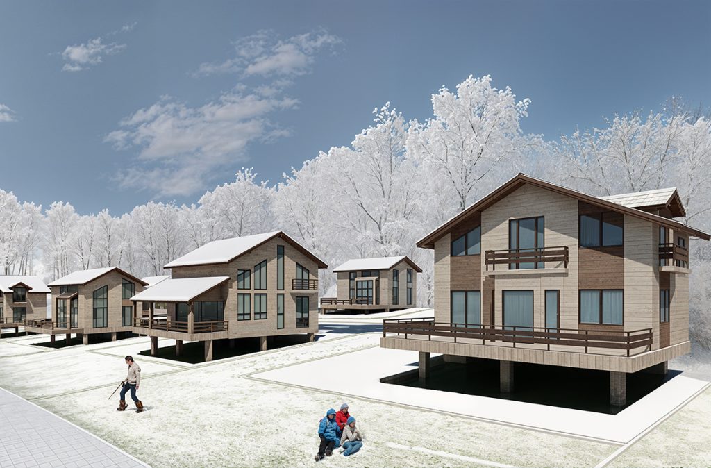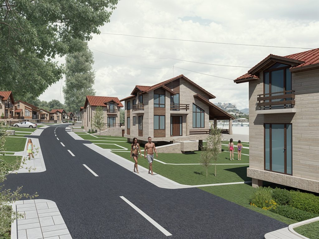 This project is a beautiful collection of modern, chalet-style villas located near the stunning Lake Sevan. Designed as a residential community, it offers a perfect retreat both relaxation and family living. The homes are built with a warm, earthy palette, featuring light-colored stone, dark wood accents, and rustic red-tiled roofs, which all blend seamlessly with the natural landscape.